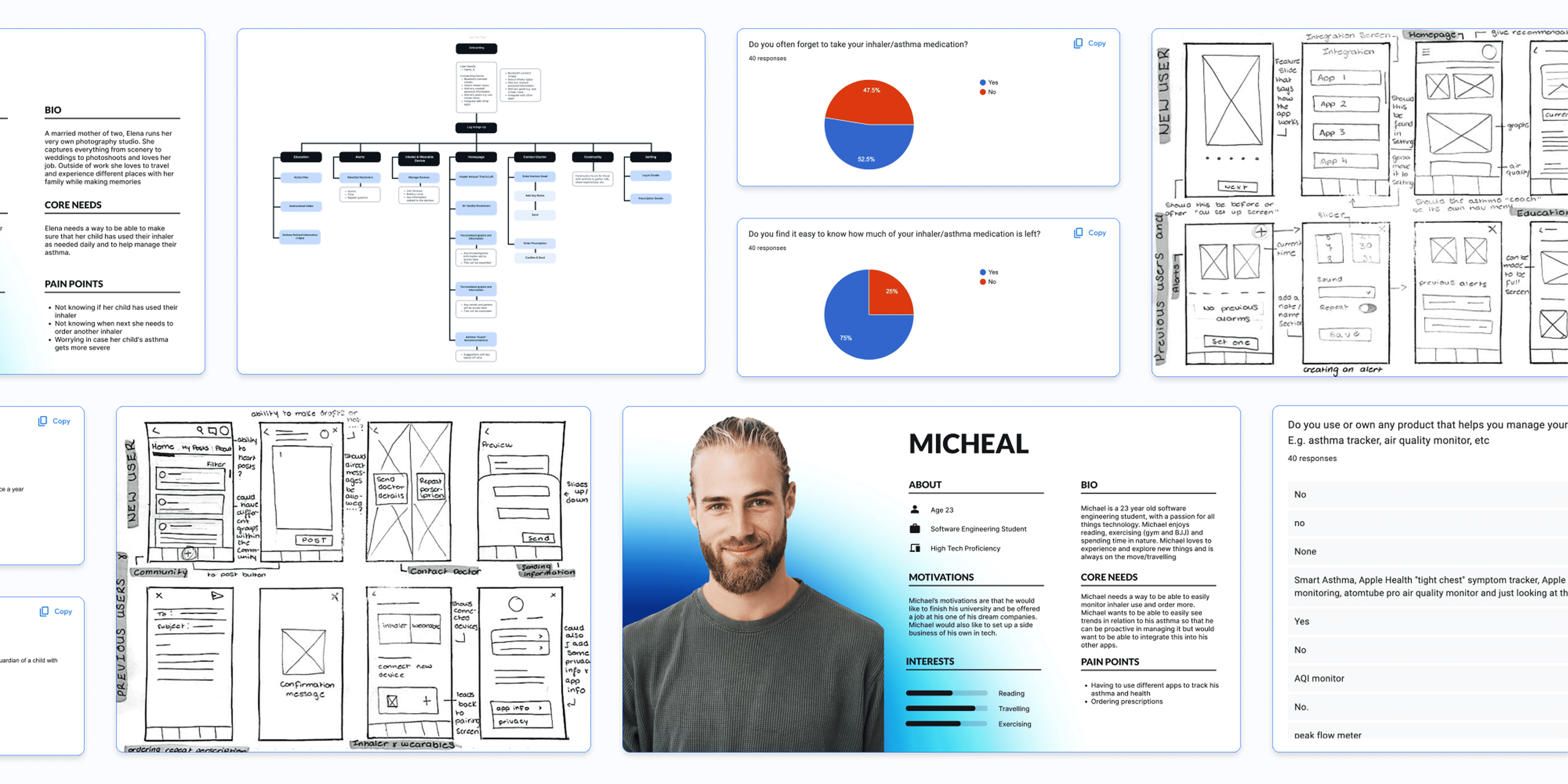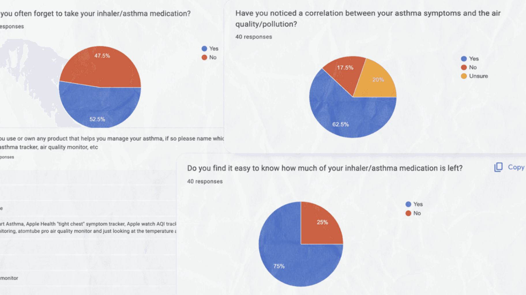 The project began with a wide exploration of possible solutions, considering multiple product and system models before committing to a single approach. I explored alternative concepts across both physical and digital touchpoints, from purely app based tools to more device led interactions, testing how each might support users at different moments in their care journey. Through this exploration, I evaluated each option against usability, clarity, emotional impact, and feasibility, gradually narrowing the scope to a solution that best balanced clinical requirements with everyday usability. In order to also better help me navigate what my final solution would be I created a question which was shared amongst asthmatics and parents of asthmatics to get their perspective of the issues they deal with the most. This process allowed the final direction to feel deliberate and grounded, shaped by trade offs rather than assumptions, and focused on delivering the most meaningful experience for users.