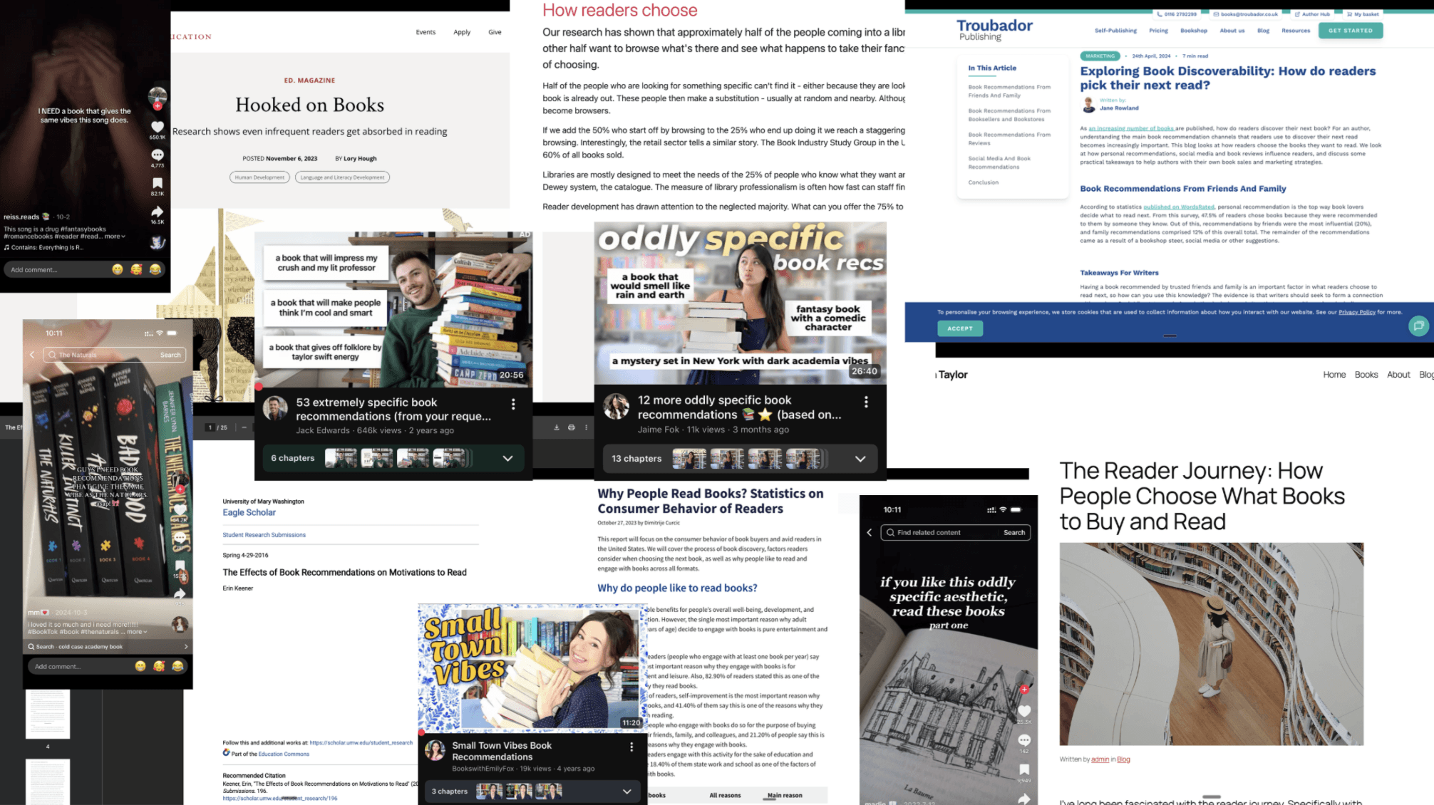 The project began with research into how people currently discover books and where frustration shows up. I explored existing platforms such as Goodreads, StoryGraph, TikTok BookTok, and in store recommendations, identifying a consistent gap between how people describe books emotionally and how platforms organize them.