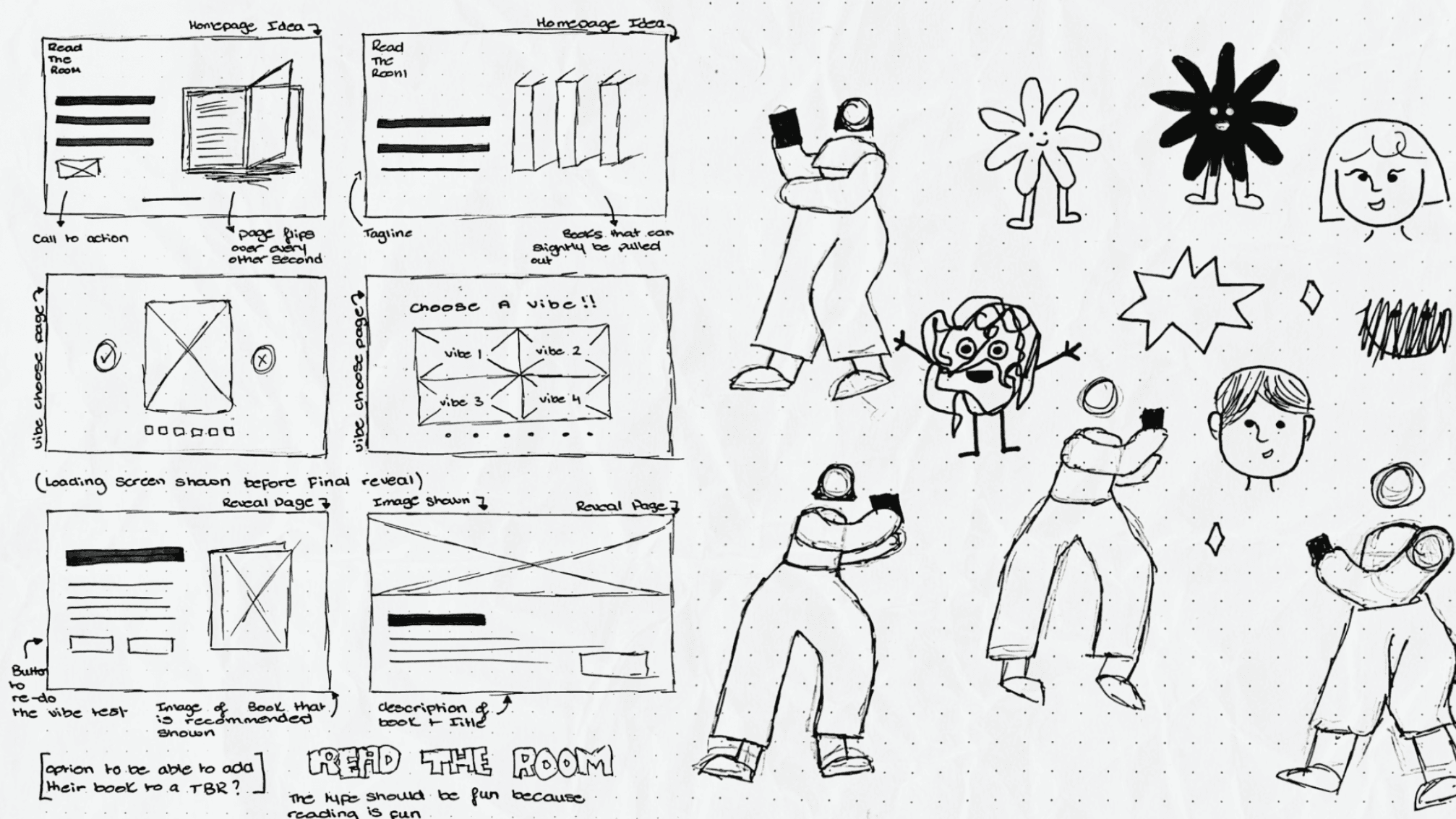 I introduced characters as a way to bring warmth and personality into Read The Room. Because book discovery can sometimes feel overwhelming or intimidating, I wanted the experience to feel friendly and encouraging from the start.